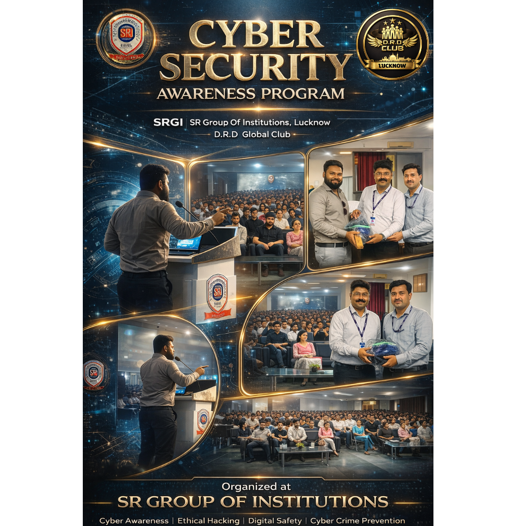SRGI – SR Group of Institutions, Lucknow recently hosted an impactful and knowledge-driven Cyber Security Awareness Session organized by the D.R.D Global Club. The session was led by renowned cyber security expert Mr. Abdul Masood, who delivered an engaging and highly informative presentation on modern cyber threats and advanced security strategies.